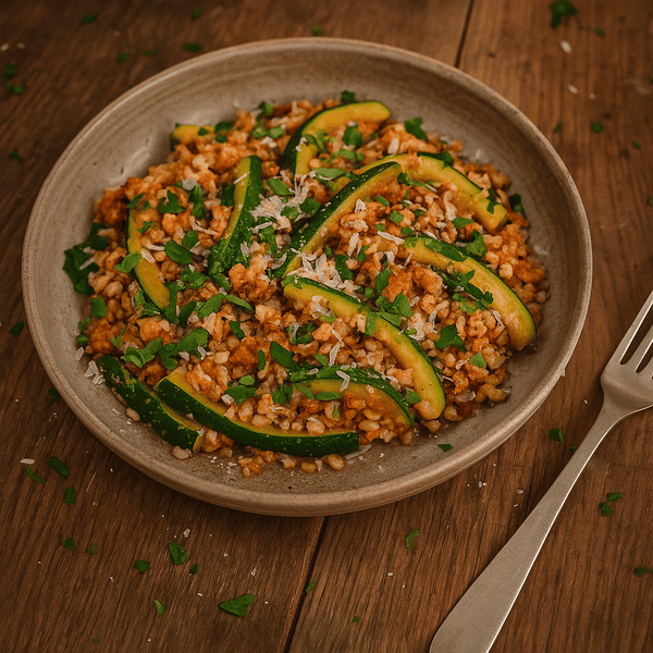 Chcesz przygotować lekkie, a jednocześnie sycące danie? Cukinia z mięsem mielonym z kurczaka i kaszą jęczmienną to prosty przepis na obiad pełen smaku i wartości odżywczych. W jednej porcji znajdziesz solidną dawkę białka, błonnika oraz witamin z warzyw, a całość dopełnia aromatyczny ser grana padano. Smacznie i zdrowo.